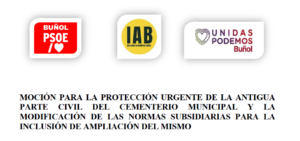 Los grupos municipales del PSOE, IU-UP e IAB han presentado una moción conjunta en el Ayuntamiento de Buñol para exigir la protección urgente del antiguo cementerio civil y la modificación de las Normas Subsidiarias, ante lo que consideran un “abandono injustificable” por parte del gobierno local.